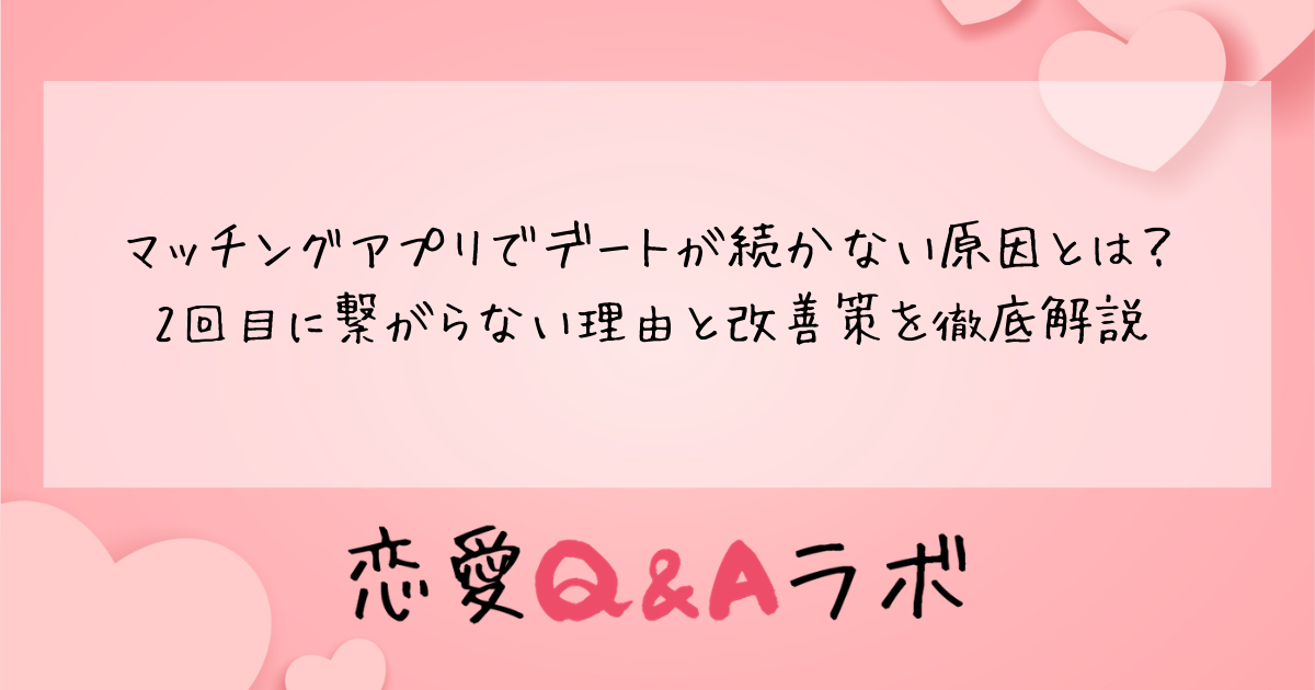 本記事では、マッチングアプリでデートが続かない原因を徹底的に分析し、2回目のデートに繋げるための具体的な改善策をお伝えします。初デートで失敗しがちなポイントから、相手との距離の縮め方、脈ありサインの見極め方まで、幅広く解説していきます。