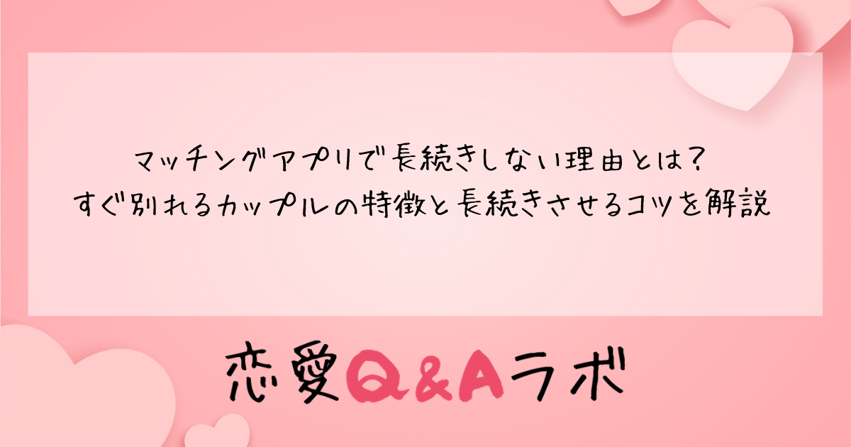 マッチングアプリで出会って付き合ったものの、なぜかすぐに別れてしまう。そんな経験をしたことはないでしょうか。「アプリで出会ったカップルは続かない」という声を耳にすることも多く、不安を感じている方も少なくないはずです。