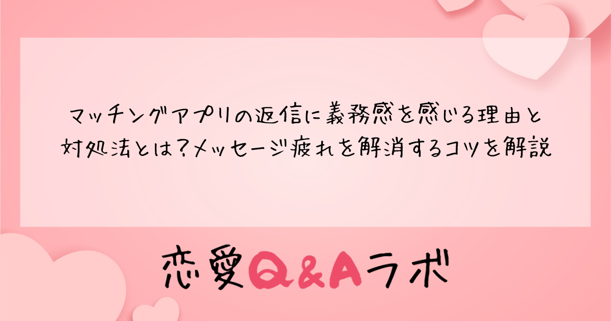 本記事では、マッチングアプリの返信に義務感を感じてしまう理由を詳しく解説し、メッセージ疲れを解消するための具体的な対処法をお伝えしていきます。