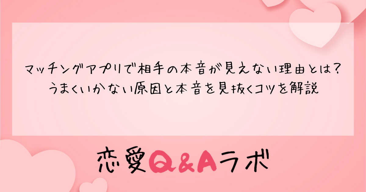 マッチングアプリでやり取りをしていると、「相手の本音が分からない」と感じることはないでしょうか。メッセージでは好意的に見えるのに実際に会うと違う、プロフィールには真剣と書いてあるのに遊び目的だった、など、相手の本心が見えずに悩む人は少なくありません。