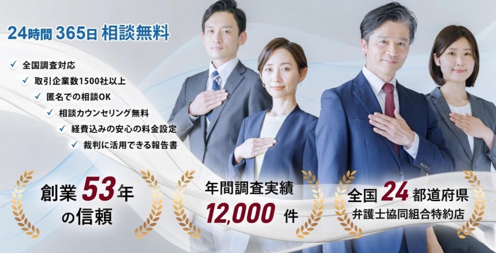 今回取り上げるPIO探偵事務所(株式会社ピ・アイ・オ)は、1972年(昭和47年)創業の業歴53年を誇る老舗探偵社。年間調査件数は12,000件を超え、全国24都府県の弁護士協同組合特約店として30年以上にわたり活動を続けています(PIO探偵事務所 公式サイトより)。