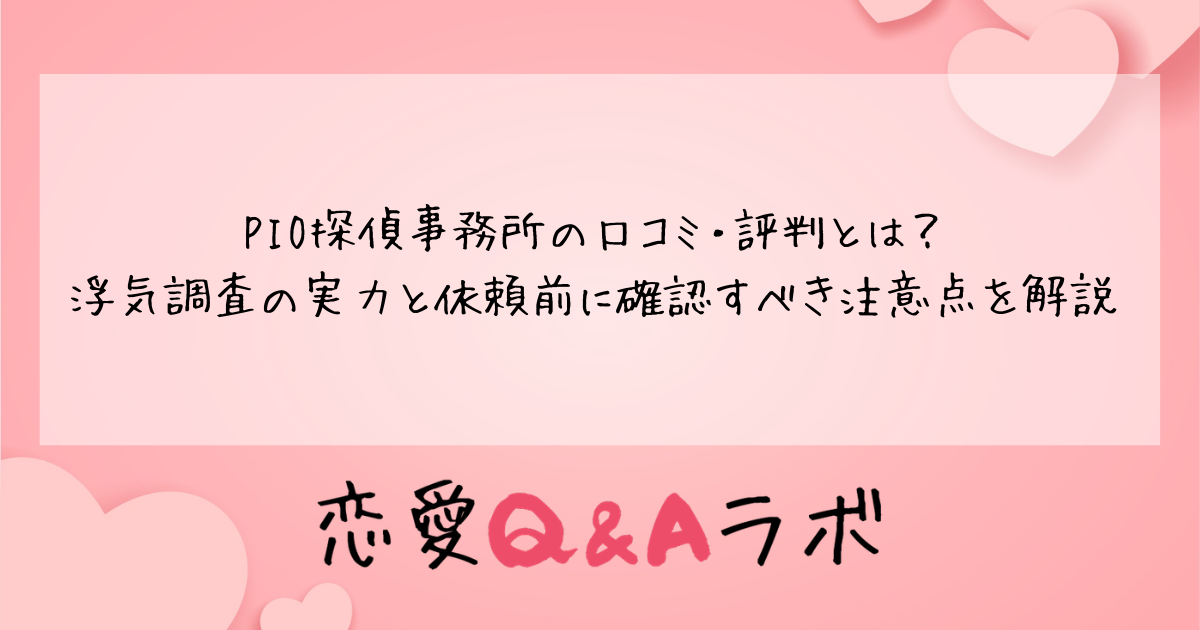 この記事では、PIO探偵事務所の口コミ・評判を良い面と気になる面の双方から整理し、料金の仕組みや他社との違い、依頼前に知っておきたい注意点まで掘り下げていきます。浮気調査や結婚前調査を検討している方にとって、探偵選びの判断材料になれば幸いです。